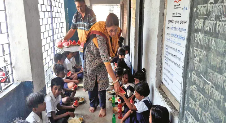 তরমুজ খাওয়ানো শুরু করেন। প্রতিদিন ভাতের পর তরমুজ পেয়ে খুশি পড়ুয়ারাও।