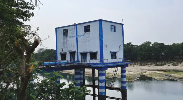 যে জায়গা থেকে জল তোলা হয়, সেখানে অল্প জল রয়েছে। পাশেই চর দেখা যাচ্ছে।